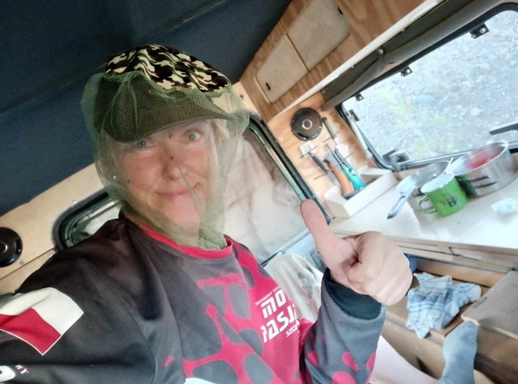 Noc spędzona we czwórkę (Agata + Natalka + Czoju), a nawet w piątkę przebiegła spokojnie. Niewysokie drzewa skutecznie przysłoniły niezachodzące słońce i dały nam odrobinę wytchnienia od jego promieni. Musieliśmy tylko przeprowadzić nad ranem niewielką ale zwycięską potyczkę z komarami, które ponownie zaczęły się przedostawać do wnętrza defenera. Pewnie mamy uszczelki w drzwiach do ponownego przeklejenia, od tych szutrów coś się poluzowało.
