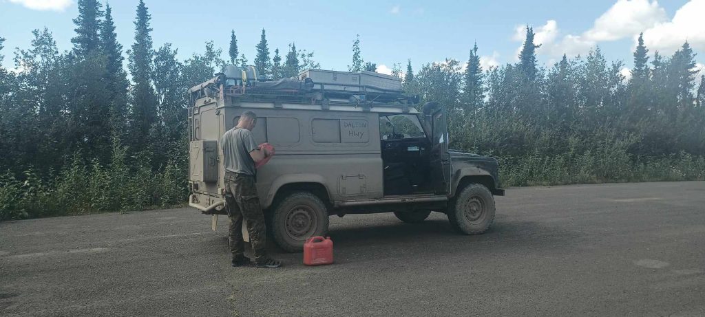 Pod koniec drogi dolewamy paliwo z naszych żelaznych zapasów leżących w bańkach na dachu. W Deadhorse zatankowaliśmy koszmarnie drogie paliwo 6,89 USD za galon. I tak lepiej niż w coldfoot, bo tam po 7,4 USD za galon.