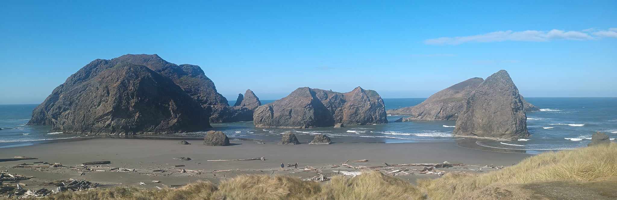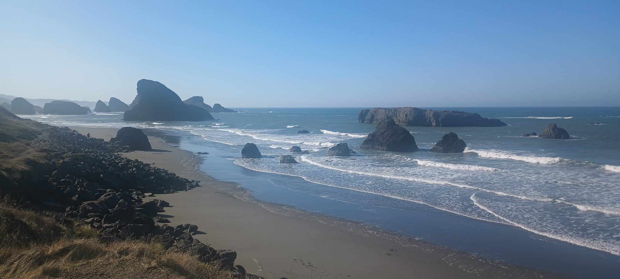 Dziś jest całkowicie odmiennym dniem od kilku poprzednich. PO pierwsze widać ocean. Po drugie jest duża przejrzystośc powietrza, co umożliwia podziwianie zatoczek. Po trzecie nie pada, więc można wyjść z auta. Po czwarte wreszcie jest naprawdę ciepło, powyżej 20 C.