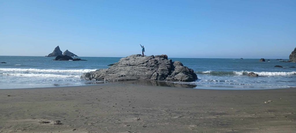 Spanie w dzikich miejscach czasem przynosi niespodzianki. Po pierwsze zgodnie z prognozami, chmury się rozwiały, zostały tylko niewielkie strzępy. Po drugie, z miejsca gdzie jesteśmy wypłasza nas staruszek z psem. Nie ma miejsca na poranną toaletę. Podjeżdżamy więc około 10 km dalej, na Rest area, jest toaleta, stoliki. Robimy więc przy plaży kawę i podgrzewamy wczorajsze placki (zostało ich dużo).