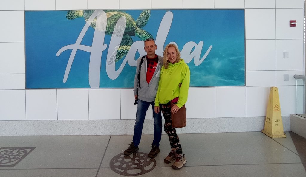 Na lotnisku idzie nam całkiem sprawnie. Drukujemy w automacie karty pokładowe przy stanowisku Hawaiian Air. Potem tylko podczas kontroli przy wejściu na salę odlotów zapominamy wyjąć komputery z bagażu i nasze walizki wracają do ponownej kontroli. Jednak poza tym gładko przechodzimy dalej i tuż po 9 rano jesteśmy gotowi do wejścia na pokład samolotu.