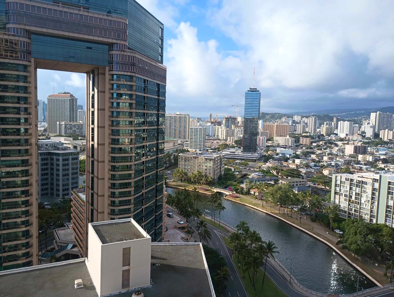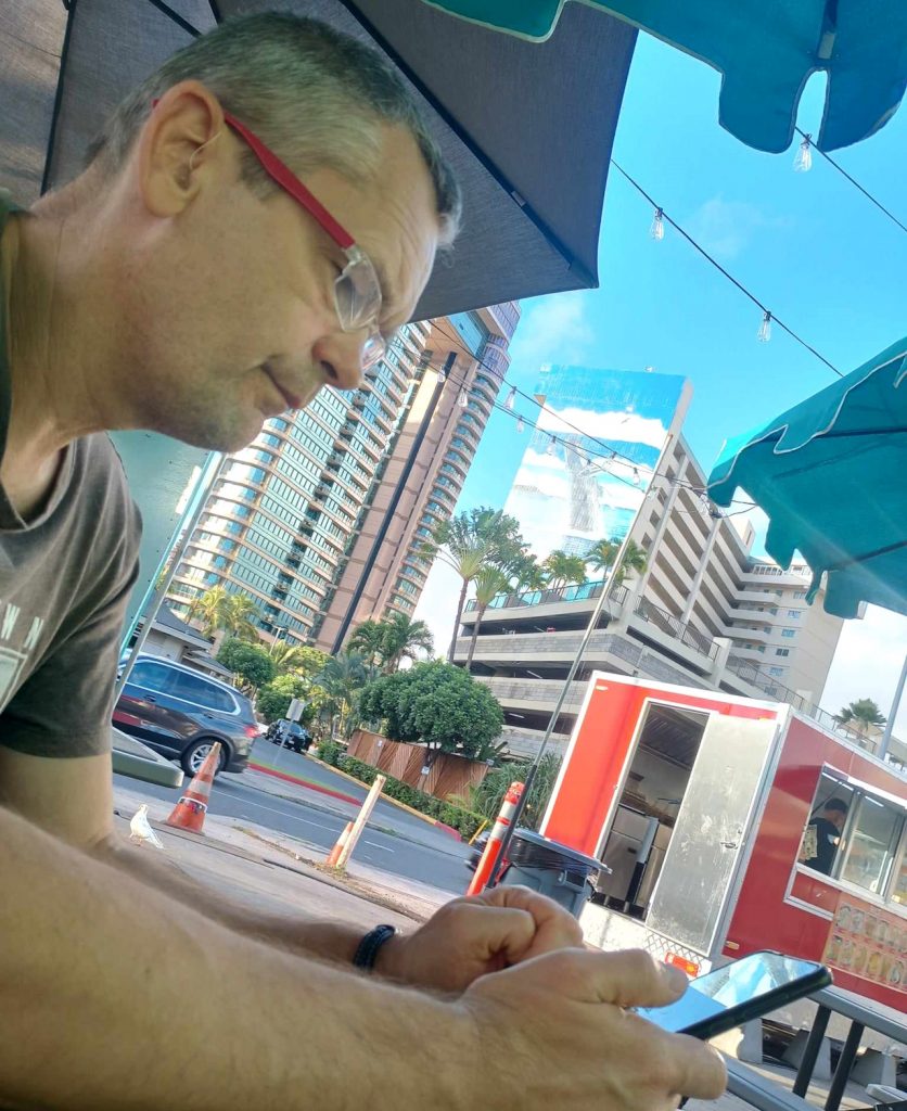 Z lotniska po sprawdzeniu cen UBERA wybieramy… autobus za 3 USD od osoby. Dojeżdżamy nim prawie na samo miejsce naszego noclegu. Wystarczy tylko dojść ze 400 m. Po krótkim rozeznaniu się z instrukcją zameldowania się w naszym wynajętym mieszkaniu, wjeżdżamy na 27 piętro. A tam taki widok na Honolulu i Hawaje 😉
