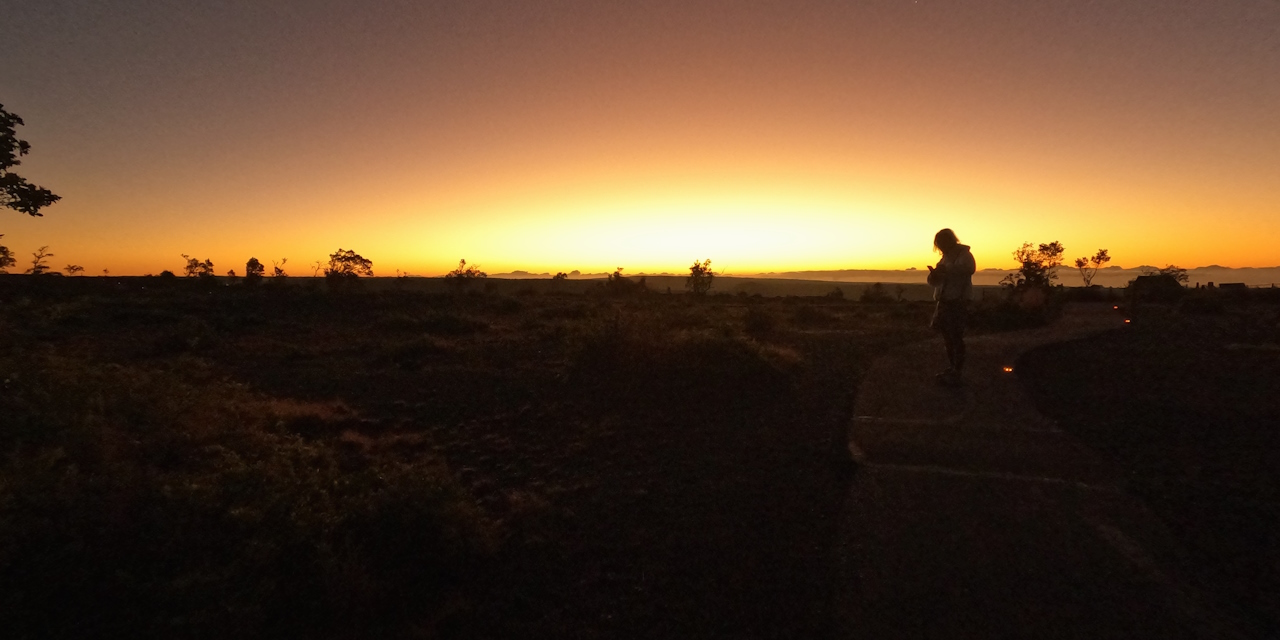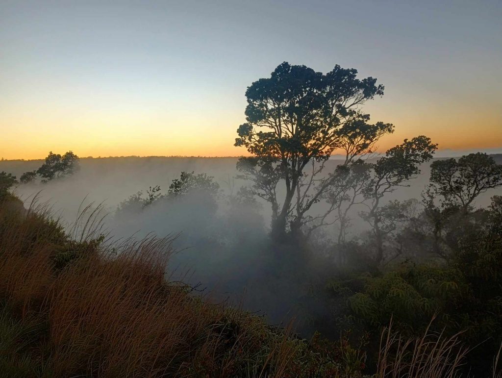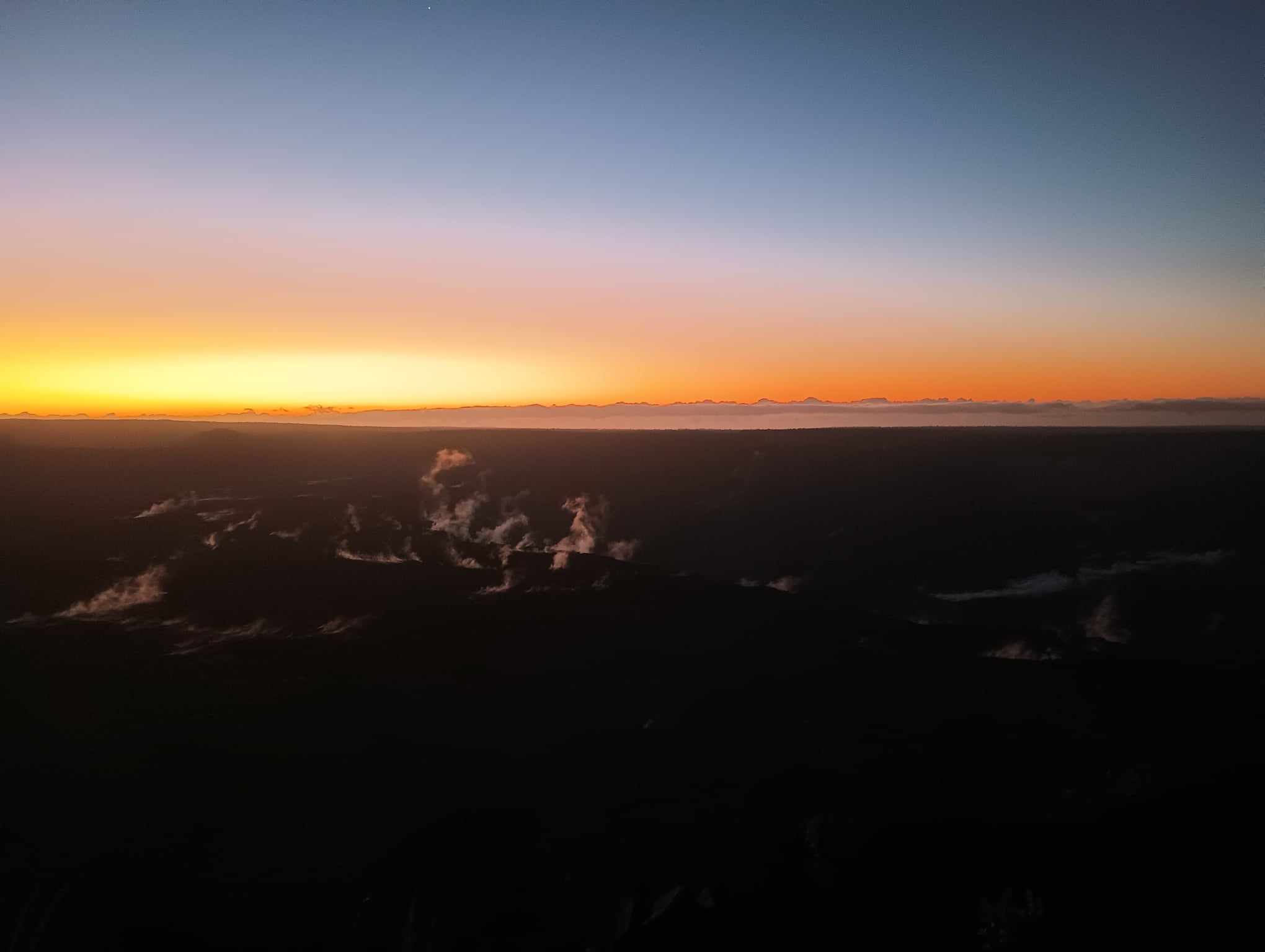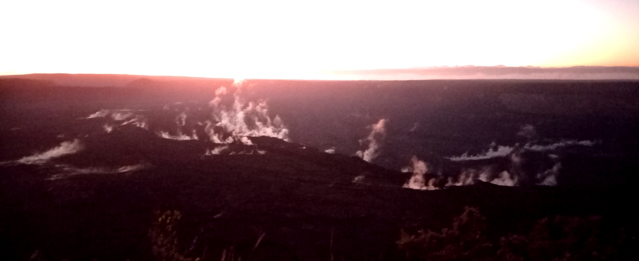Po pokonaniu około 20 mil, wjeżdżamy do parku główną bramą. Nikogo na niej jeszcze nie ma i jest wciąż ciemno. Rozglądamy się przez chwilę w centrum informacji, ale niestety jest też zamknięta. Decydujemy się pojechać na pierwszy punkt widokowy. I to był strzał w dziesiątkę! Dookoła ciemność, a na horyzoncie zaczęła pojawiać się czerwona poświata. Z każda minutą była coraz jaśniejsza. W jej promieniach zaczęliśmy dostrzegać unoszący się dym z ogromnej doliny przed nami. W ciągu kilku minut ujrzeliśmy kilku kilometrowej szerokości krater wulkanu….