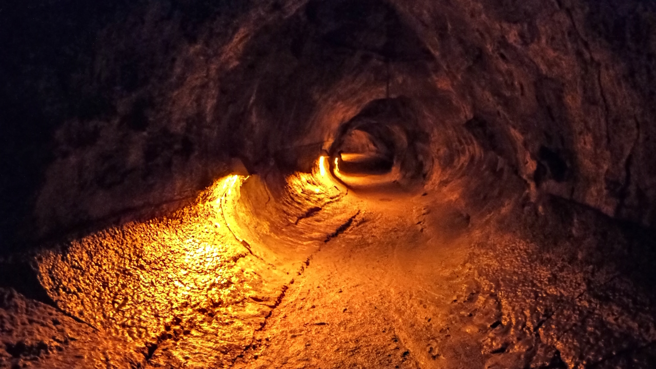 Jednym z ciekawszych miejsc w tym parku na Hawajach jest naturalny tunel wydrążony przez przepływającą w przeszłości lawę. Schodzimy do niego po kilku poziomach schodów. Całe szczęście wewnątrz założono oświetlenie, bo ciemność byłaby całkowita ;). Tunel lekko zakręca i ma około 200 m długości. Po drugiej jego stronie znajdują się podobne schody którymi wychodzimy na powierzchnię.