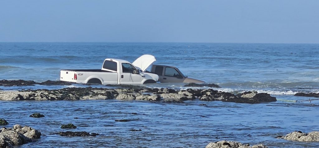 Nastąpił okres przypływu i jak widać na zdjęciach skończyło się to katastrofalnie! Fale zaczęły podmywać samochody a potem zalewać je po sam dach. Żadne działania właścicieli nie były w stanie nic pomóc. Dopiero po kilku godzinach zorganizowano dźwig z bardzo długą liną i jeden po drugim udało się je wydobyć. Jednak zniszczenia aut były bardzo duże.