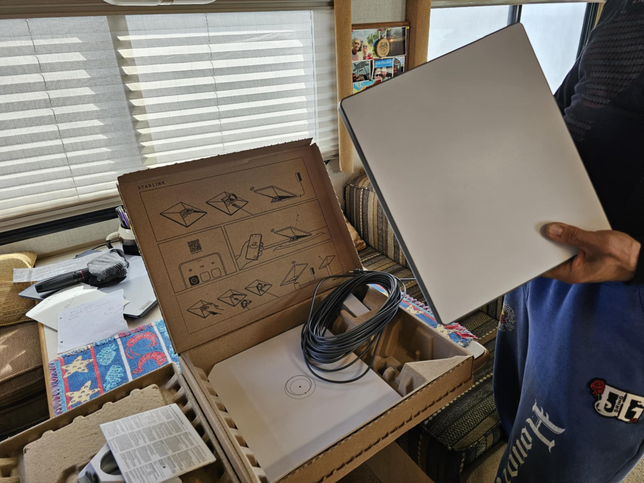 Wczoraj się zdecydowaliśmy. Kupiliśmy Starlinka. Najpierw próbowaliśmy zamówić antenę na stronie Starlinka, ale coś nie działało na terenie Meksyku. Finalnie kupiliśmy bezpośrednio w sklepie Radio Shock. Następnie urządzenie zainstalowaliśmy na dachu kampera, ściągnęliśmy aplikacje, uruchomiliśmy internet, oczywiście płacąc za pierwszy miesiąc… i mamy internet.