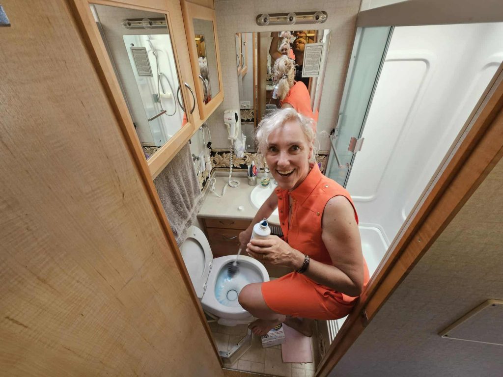 Przy wyjeździe spóściliśmy zawartość szarego i czarnego zbiornika. Mogłam spokojnie czyścić toaletę. Brakuje tylko torebki Hermesa… 🙂 taki żart sytuacyjny Po prostu do tej pomarańczowej sukienki którą Iwona mi podarowała nosiła kiedyś torebkę Hermesa.