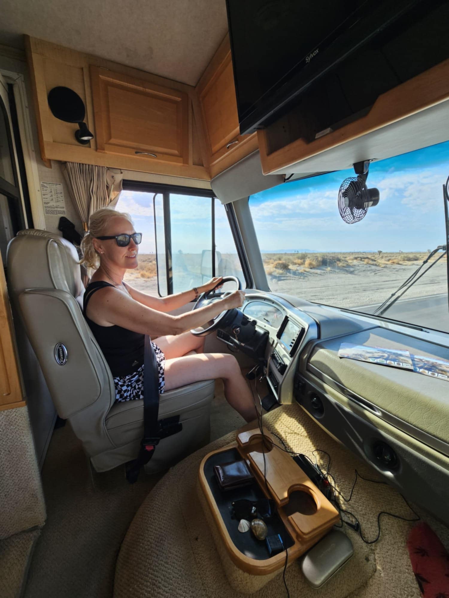 Droga to przede wszystkim puste i półpustynne obszary ciągnące się przez dziesiątki mil tej części Kalifornii. Dziś jest też pierwszy dzień „nauki” jazdy kamperem z przyczepką mojej żony.