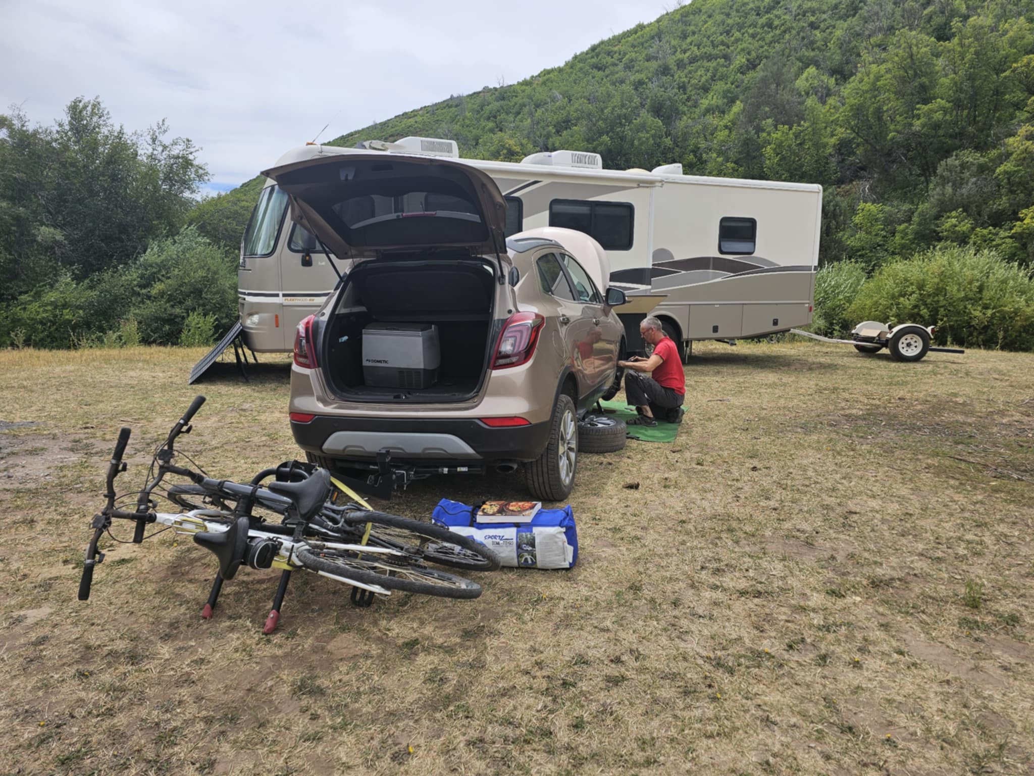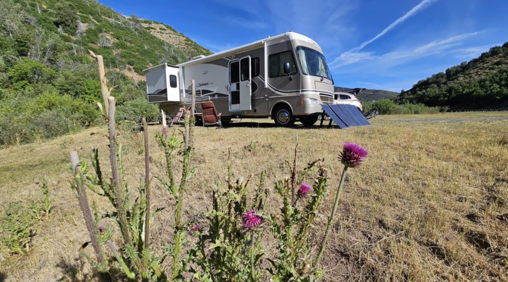 Wracamy na nasze miejsce kampingowe, rozkoszujemy sie życiem, chłodno. Nie ma słońca, chmur dużo. Panele ładują w bardzo małym stopniu.