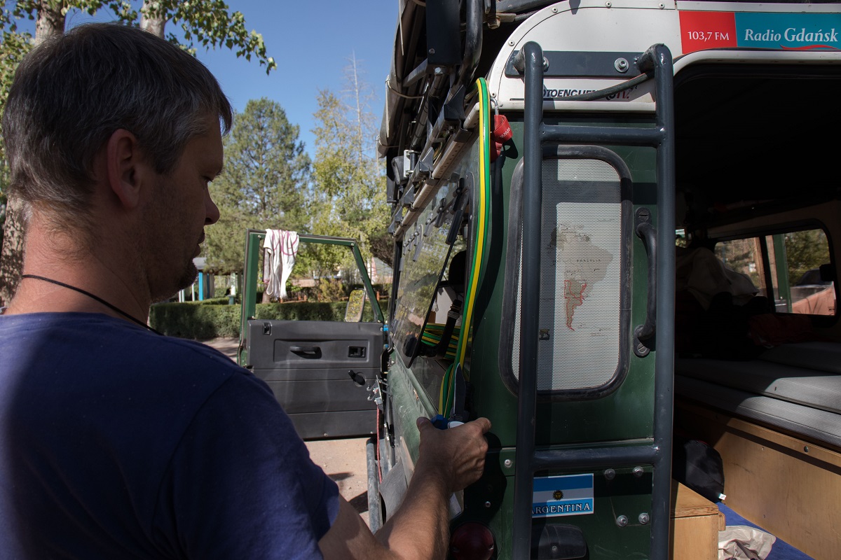 Ogromnie pracowity dzień dzisiaj, podobnie jak wczoraj. Dalszy ciąg montowania systemu wodnego w naszym Defenderze. Finałowy montaż kurka z wodą na ściance defenera. Przyzwyczailiśmy się do bycia w jednym miejscu. Camping w Malarque jest naszym „drugim domem” jesteśmy tu już drugi raz, poprzednio na motocyklach również zatrzymaliśmy się w tym miejscu. Jest to powodem naszej łatwiejszej aklimatyzacji. Po owocowym śniadaniu ruszamy na miasto, ponieważ okazało się że do skończenia instalacji wodnej potrzebnych jest kilka drobiazgów. Odkrywamy fantastyczny sklep warzywno – owocowy, ogromna powierzchnia i wszystko, wszystko łącznie z truskawkami…