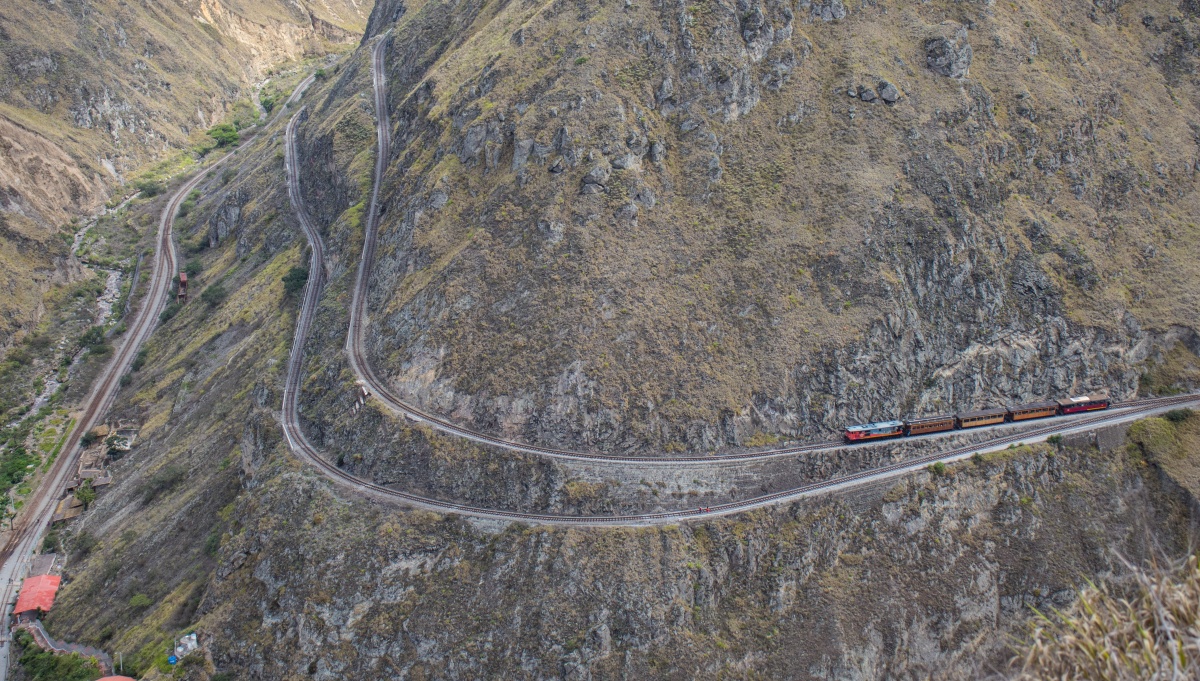My udajemy się w drogę powrotną na górę kanionu. Jest tam kolejny punkt widokowy, tym razem jakieś 500 m wyżej i widać stacyjkę i tory z bardzo wysoka. Dojeżdżamy kilka minut przed tym jak pociąg rusza z dołu i możemy obserwować jak wspina się po licznych łukach i po kilku minutach znika za kolejnym zakrętem.