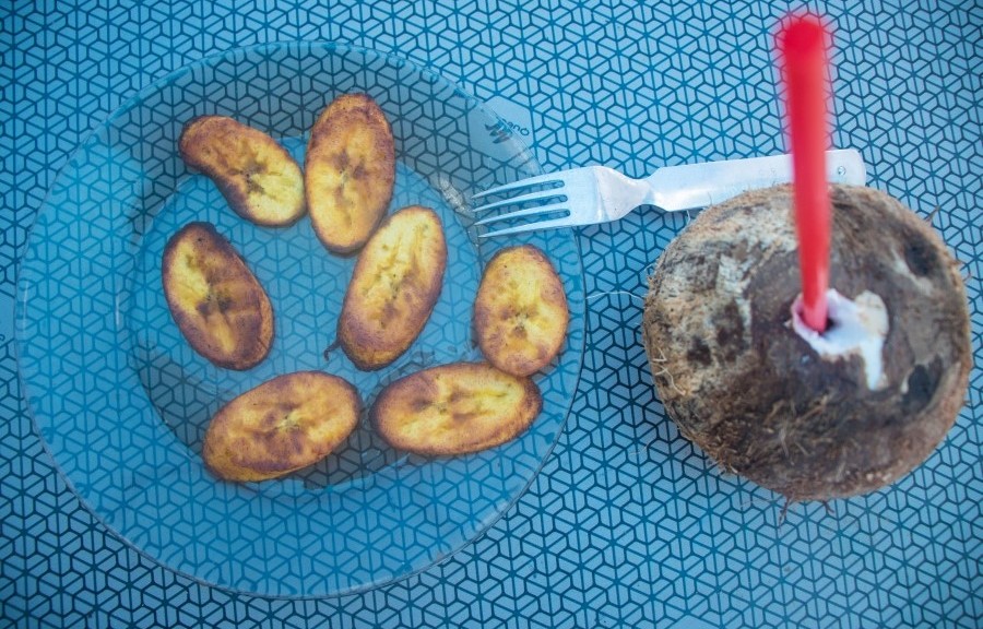W ciągu dnia smażę banany, bo bardzo je lubię. Dużo tu bananów, a właściciel częstuje nas za każdym razem. To raczej takie banany do smażenia,  choć zależy od odmiany.