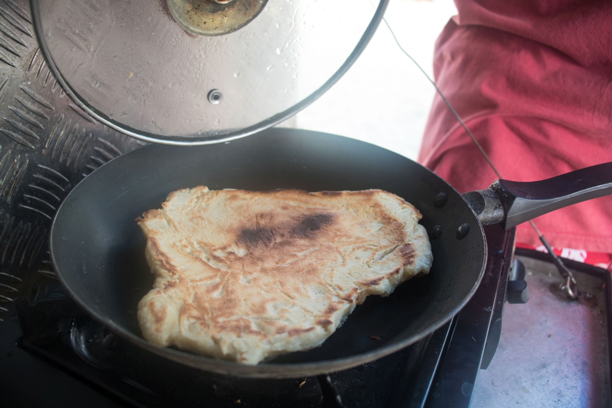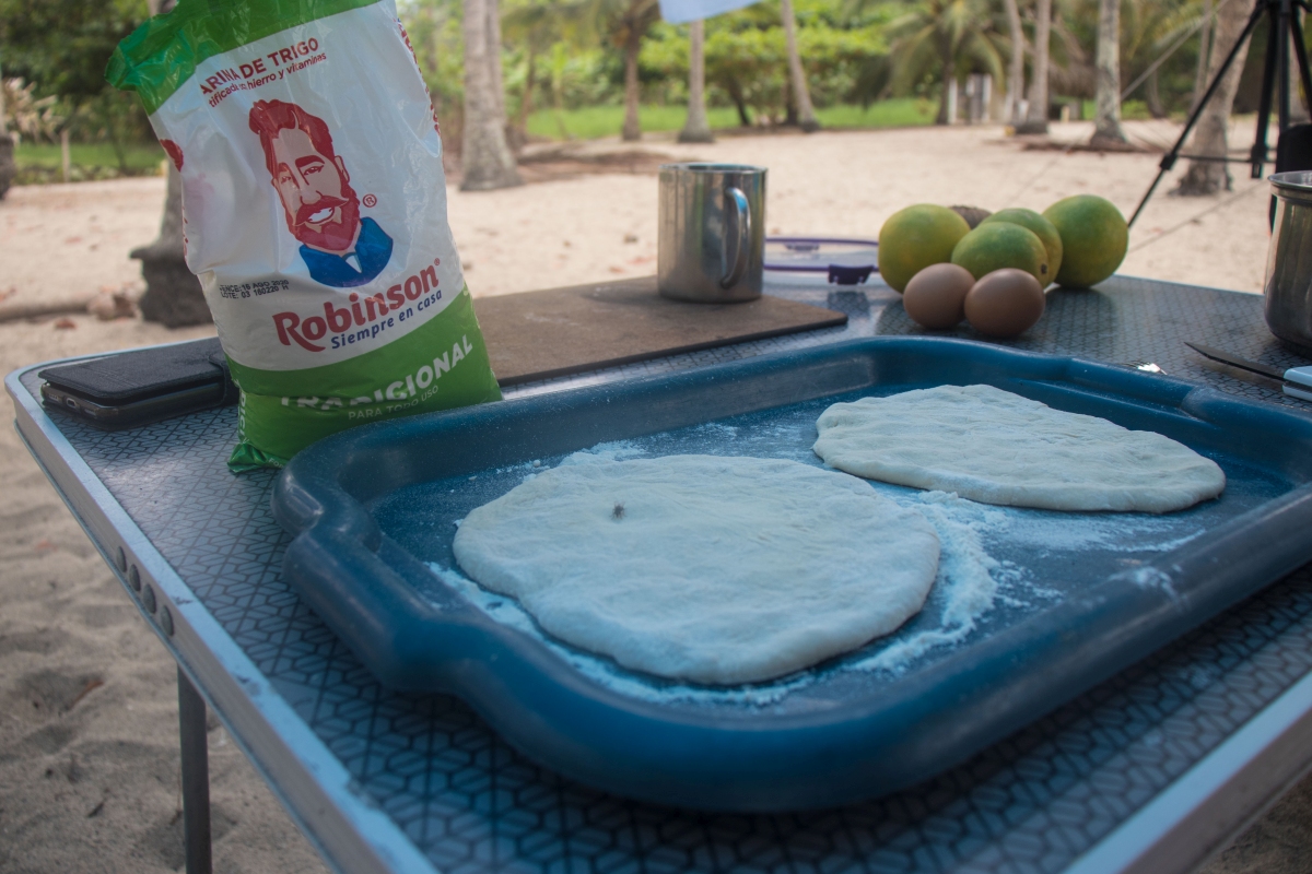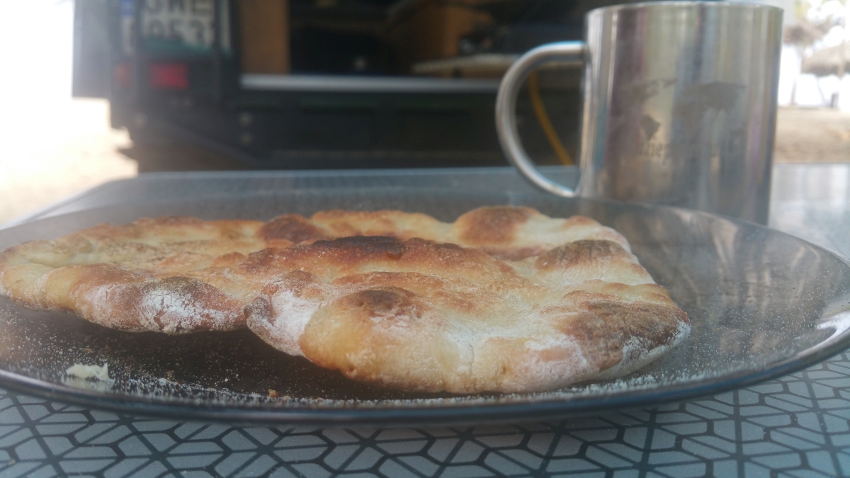 Czas leci. To już Sobota przedświąteczna. Krzysiek się dziś zirytował, że nie może tu nigdzie w piekarniach trafić na dobry chleb, poza wielkimi sieciówkami typu Exito, gdzie jako takie są jeszcze bagietki. Poza tym trudno, bo większość chlebków i bułek jest słodka! dziś wiec postanowił wypróbować przepis z internetu na chlebki. Niby chlebki, ale przynajmniej słone. Dla nas największy problem jest taki, ze nie mamy piekarnika, anie pieca. Jak tu zrobić chleb bez pieca?? Ano na patelni. Może nie jest to chleb, ale takie coś pomieszana maca z hinduskimi chlebkami naan, lekko pomieszane też z podpłomykami, tyle tylko że drożdżowe. Ale bardzo dobre.. W sumie… z masełkiem jak znalazł do jedzenia… I chrupiące i cieplutkie…