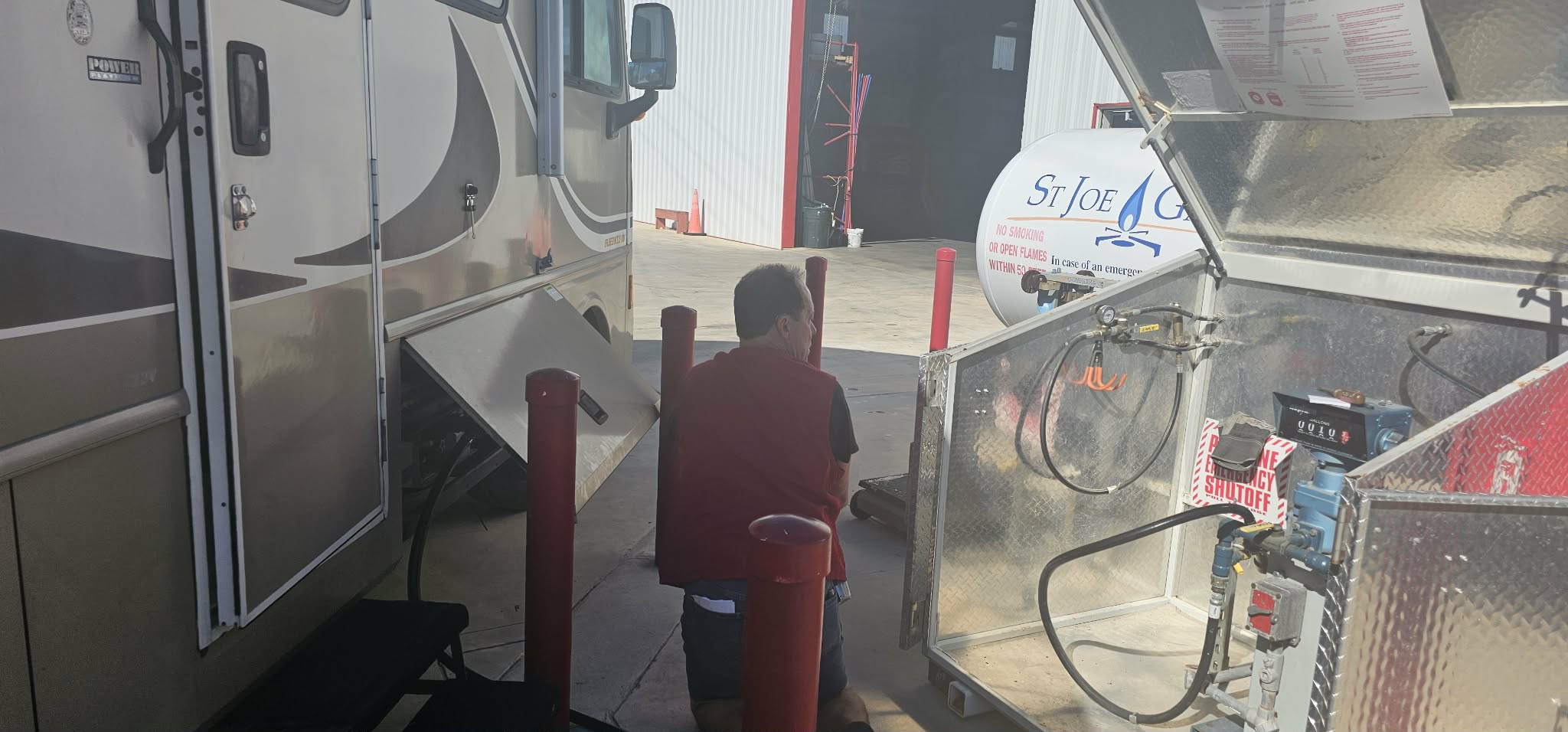 Najczęściej propan można zatankować przy dużych truck stopach, takich jak Flying J, Pilot, Love’s czy TA/Petro. Nie każda lokalizacja ma instalację do propanu, ale to jedne z pewniejszych miejsc w trasie. Bardzo dobrym i sprawdzonym rozwiązaniem są też punkty U-Haul – wiele osób podróżujących RV właśnie tam uzupełnia gaz, bo mają doświadczenie z kamperami i wiedzą, co robią.