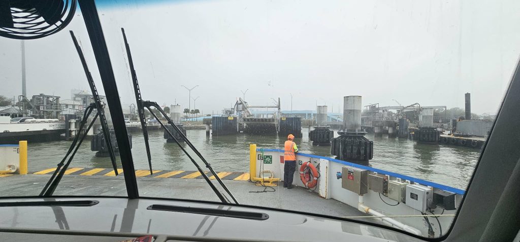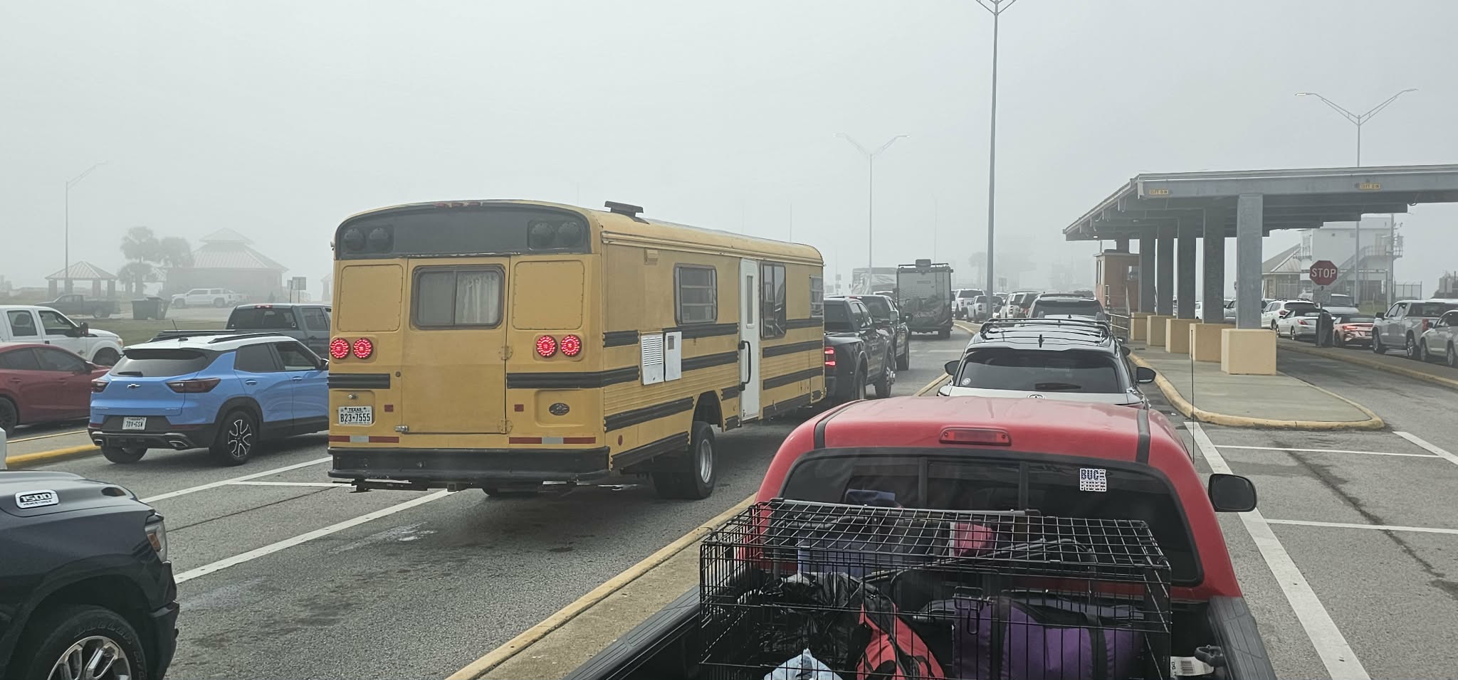 Jakoś tak ciepło się zrobiło, że w nocy aż nie można spać…. Rano wstajemy wcześnie… A potem jedziemy i jedziemy. POnad 200 mil do przejechania. No taka mgła że nie można wytrzymać. Jedziemy, jedziemy i jedziemy. Ale najdłuższe dwie godziny musimy przeczekać w kolejce na prom na wyspę Galvestone, gdzie mamy w parku stanowym zarezerwowany kamping.