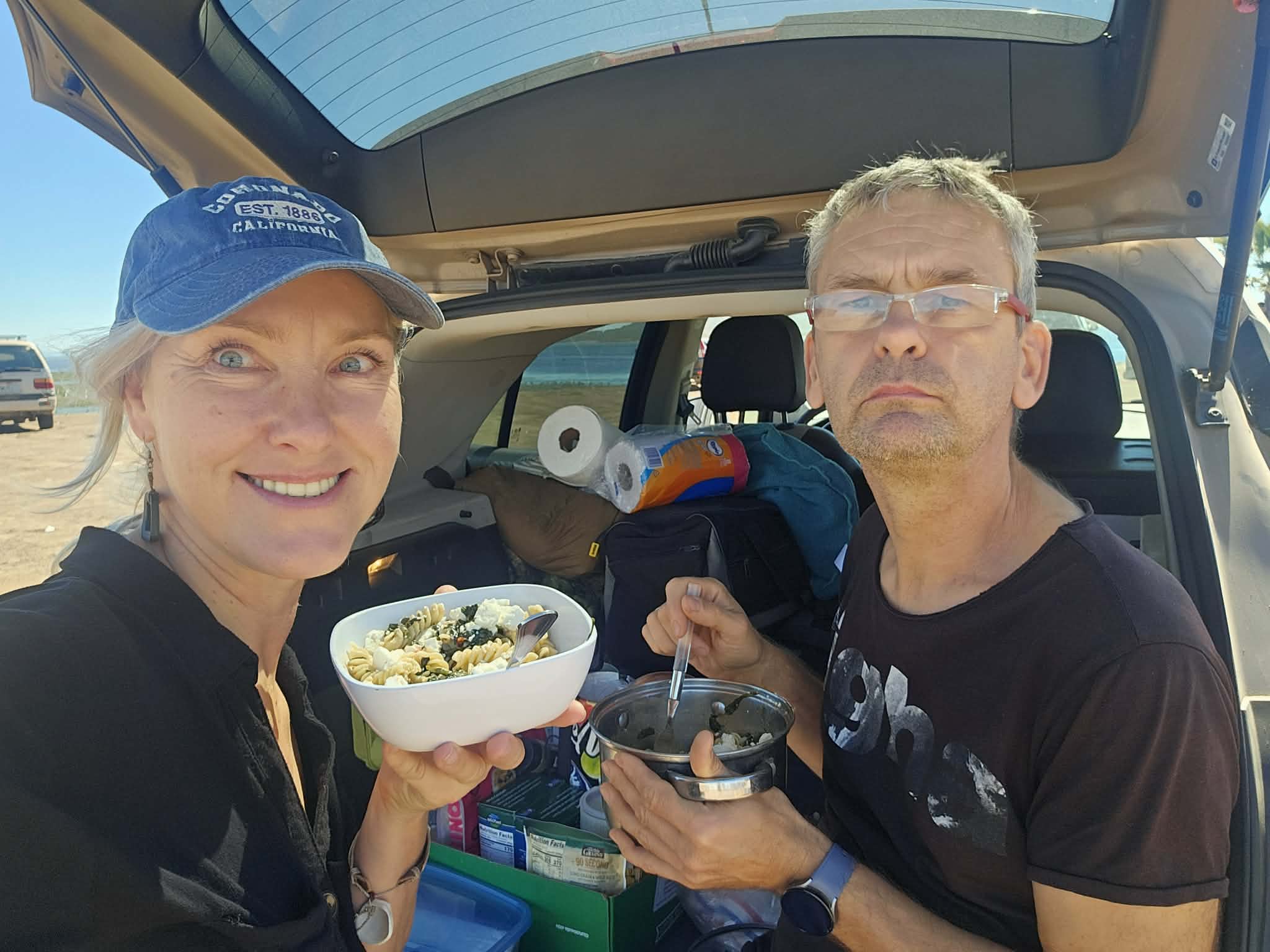 Nareszcie ruszamy. Poranek dosyć intensywny. Poranna kawa, przynajmniej część z nas ja pije. Ja od kilku miesięcy jestem na specjalnej diecie i zrezygnowałem z wielu używek… Czasem oczywiście złamie tą zasadę jednak bardzo rzadko.! Zatem prawie przed wschodem słońca robimy jeszcze na szybko lunch do pudełek, żeby mieć zdrowe jedzenie na początek wyprawy. Zresztą wczoraj moja żona gotowała zupę do słoików i sos. Nie od parady przecież zabieramy taka dużą lodówkę. Inna sprawa że do Cabo san Lucas jest około 1600 km, i niewiele cywilizacji…
