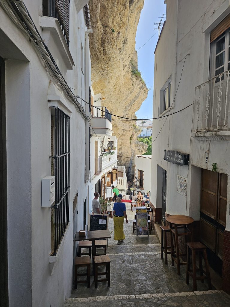 W każdym razie wstajemy i jedziemy do Setenil de las Bodegas. Jest to jedno z najbardziej niezwykłych miejsc w całej Andaluzji, którego unikalność wynika z niemal organicznego połączenia architektury z geologią. W przeciwieństwie do wielu innych białych miasteczek, które budowano na szczytach wzniesień w celach obronnych, Setenil rozwinęło się w wąwozie rzeki Trejo. Mieszkańcy nie tyle budowali domy pod skałami, co wykorzystywali naturalne nawisy skalne jako gotowe dachy i ściany swoich domostw. Ta symbioza stworzyła fascynujący krajobraz ulic, takich jak Cuevas del Sol i Cuevas de la Sombra, gdzie potężne bazaltowe bloki dosłownie wiszą nad głowami przechodniów, tworząc naturalną izolację termiczną, która od wieków chroni przed andaluzyjskim upałem.