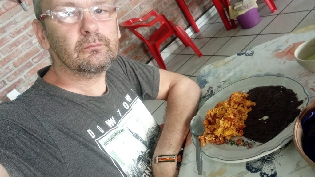 U nas dziś „techniczny” dzień. Na śniadanie poszliśmy osobno. Ja do knajpki na dole naszego budynku. Nawet sporą porcję jajecznicy z mięsem plus placki i purre z fasoli dostałem 😉
