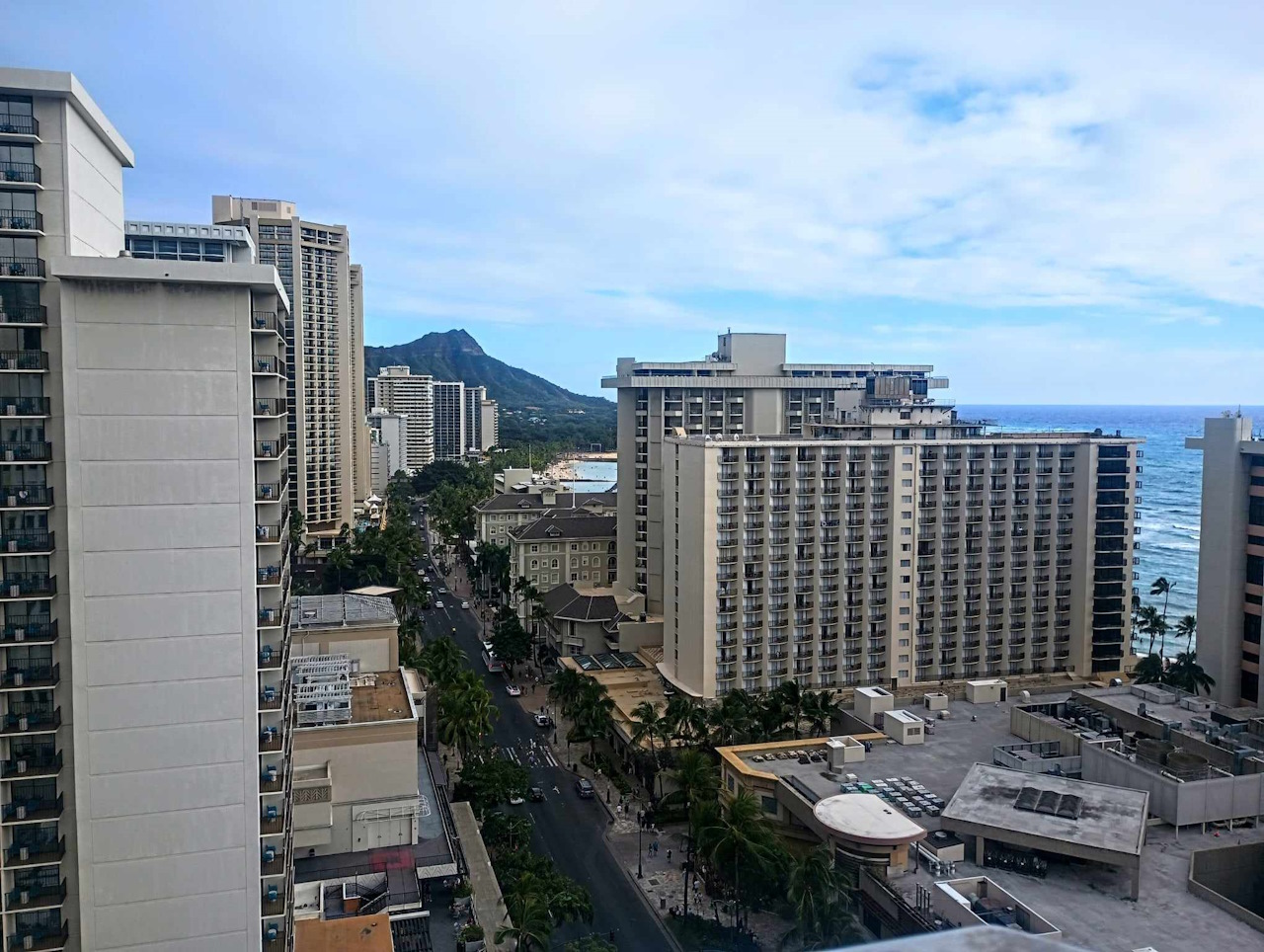 Dziś oczekiwaliśmy zapowiadanego na popołudnie deszczu. Rano skoro świt, czyli o 8.00 poszliśmy oddać kluczyki i papiery od pożyczonego auta. Wcześniej zjedliśmy śniadanie. Jajka to zawsze dobra opcja, tak też jest i tym rankiem. Dobrze, że w tym mieszkanku, a raczej jego części jest kuchnia. Można bez problemu sobie coś ugotować. Skoro już wyszliśmy oddać auto to zaliczyliśmy także krótki spacer po plaży Waikiki. To tam widać w oddali Damond Head, słynny wulkan, który raczej już nie jest czynny.