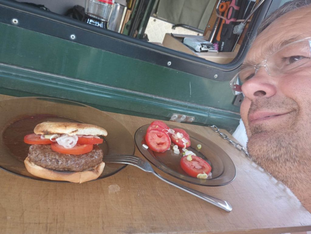 Potem smażymy wspaniałe hamburgery, jemy po dwa na głowę rozkoszując się smakiem. Korzystając z odpalonej maszynki gotujemy ciepłą wodę, myję włosy, robimy zupę na jutro, by już nie tracić czasu. Układamy plan na jutro i następne dni..