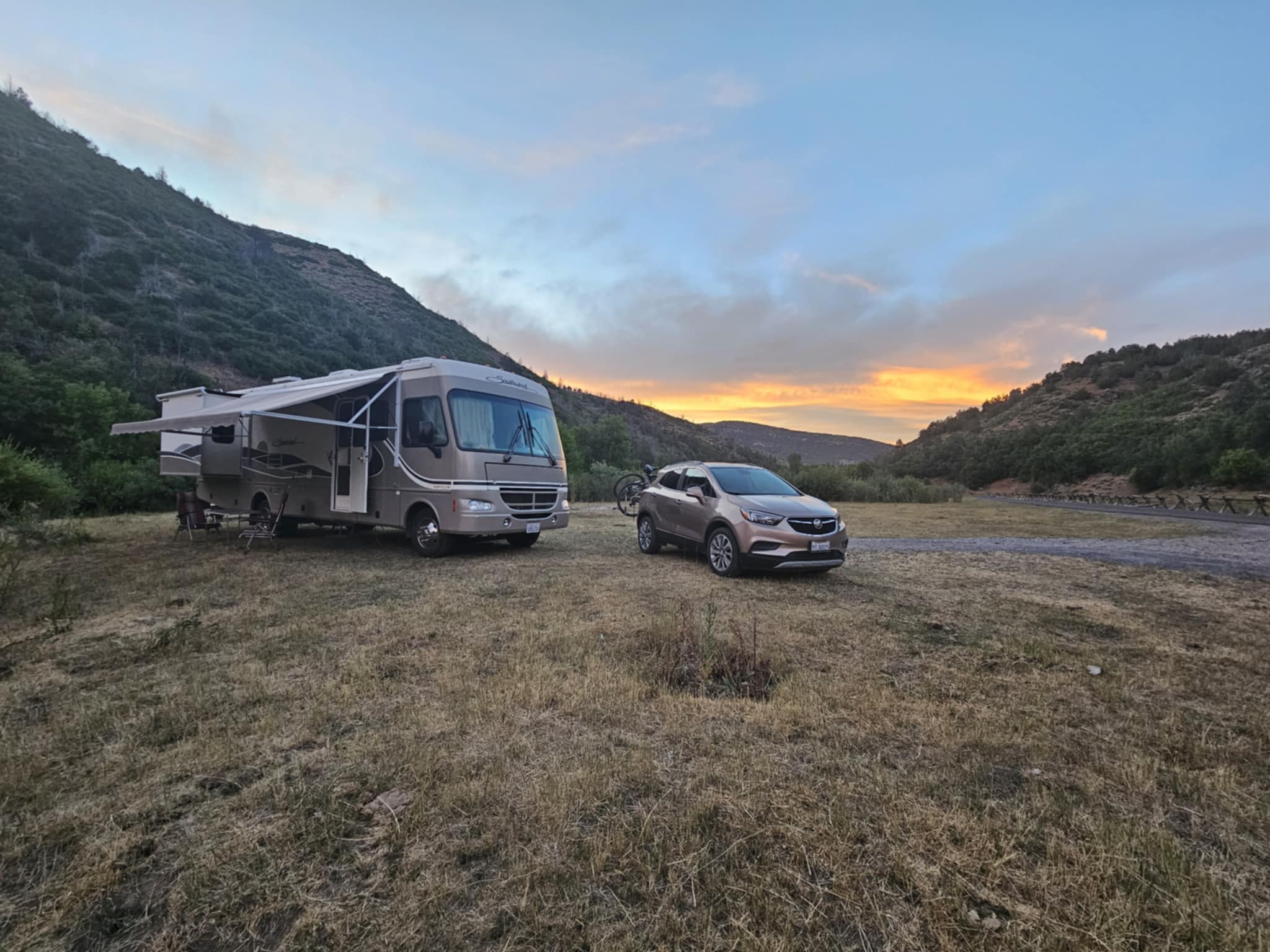 Potem jedziemy w strone wypatrzonego campingu. Najpierw mały zonk, bo na campingu Diamont noc to 31 usd i do tego 10 za samochód. Olewamy to i jedziemy dalej. Niestety potem jest strefa kolejnych kilku mil, gdzie nie wolno nocować kamperami. Ale już po 12 milach od głównej drogi hulaj dusza. Znajdujemy płaską polanę, dużą i rozkładamy sie z naszym majdanem. Ja oczywiście po godzinie biorę rower i jadę na rekonesans. Jet wiele miejsc także dalej, wobec tego może i na ewentualną przyszłość.