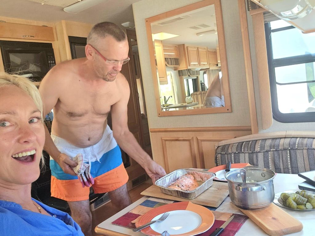 Krzysiek piecze wieprzeowinę, by miec do swoich sałatek wsparcie z białka. Od razu super gorąco na cały dom. Ale na obiad w nagrodę pyszny łosoś. Oj, to lubię…