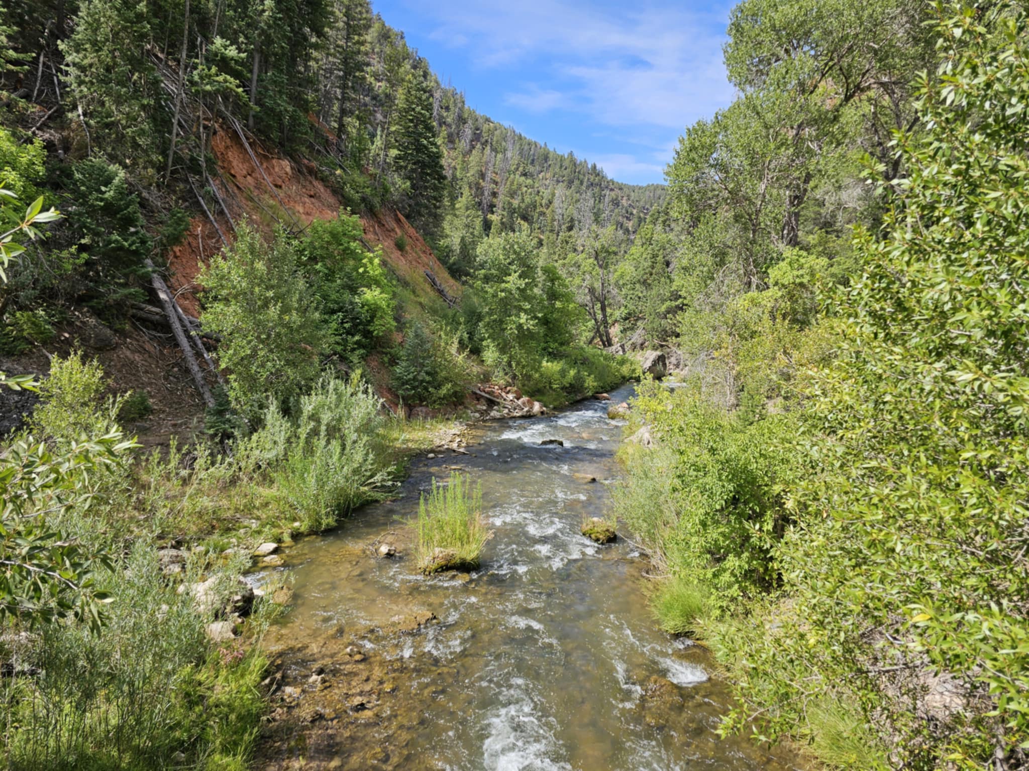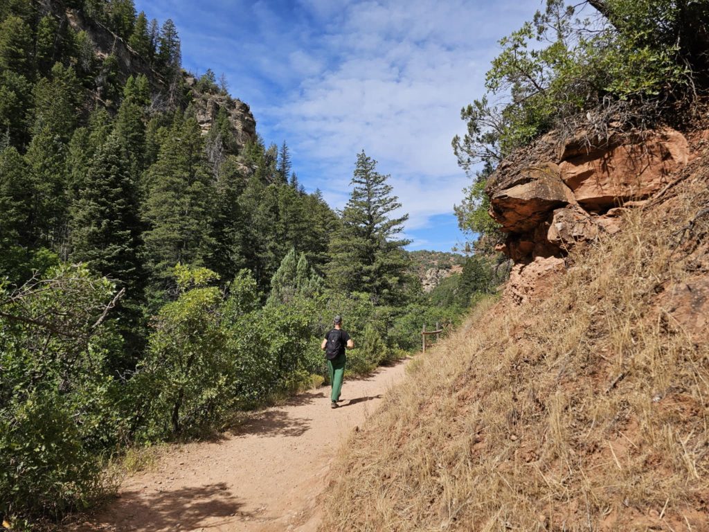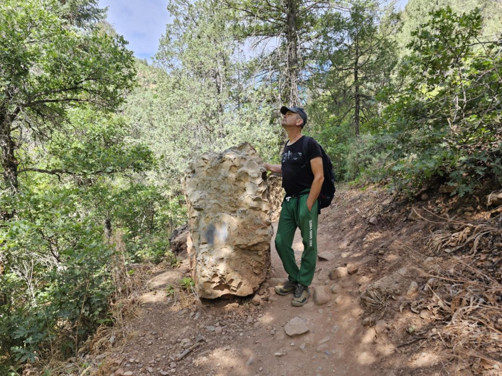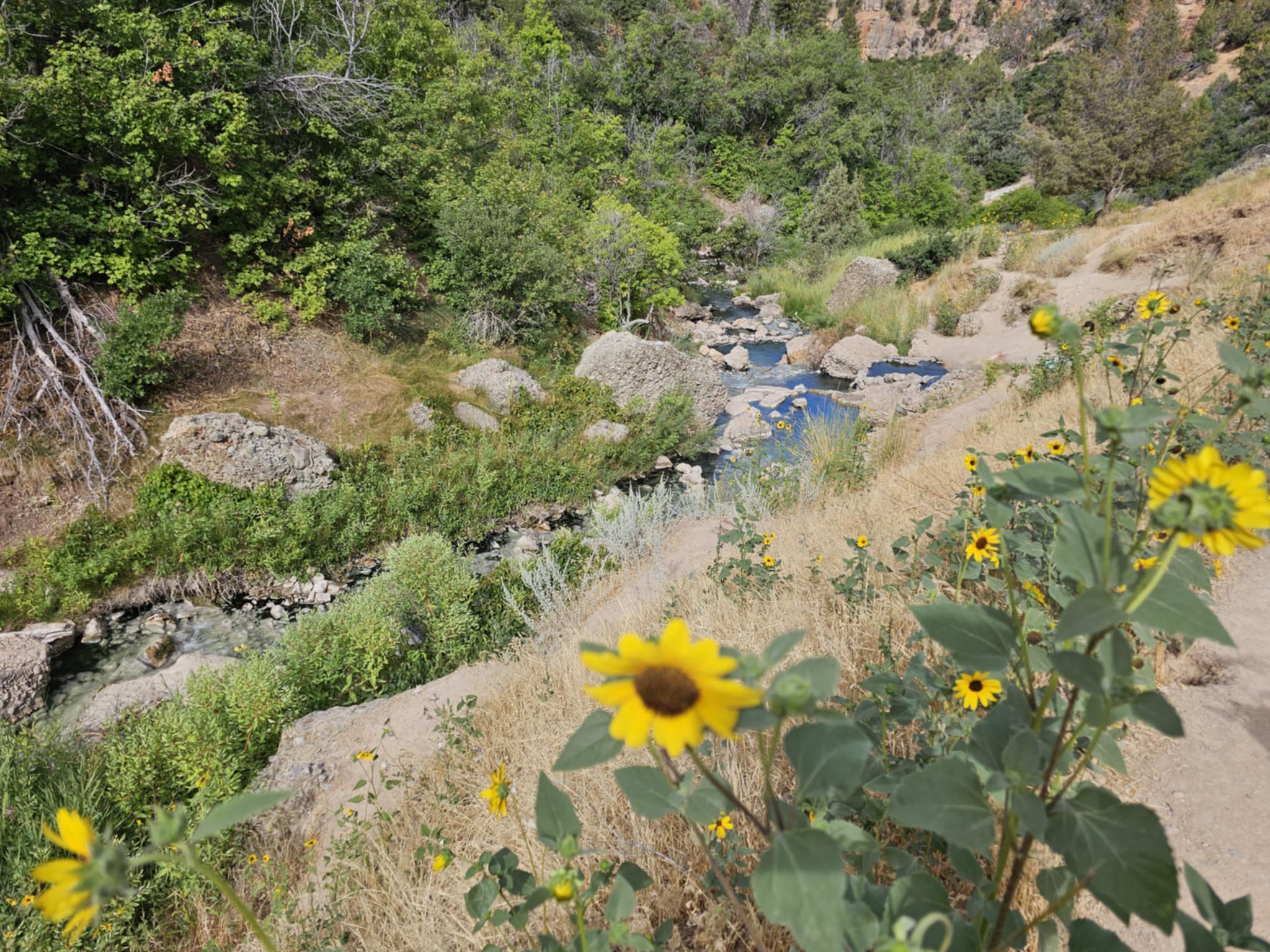 Trasa wygląda przyjemnie, ale szybko okazuje sie że jednak jest pod górę i pod górę. Na szczęście nie jest zbyt stromo i w półtorej godziny pokonujemy całkiem malowniczą trasę, w cieniu drzew w większości, cały czas wzdłuż strumienia.