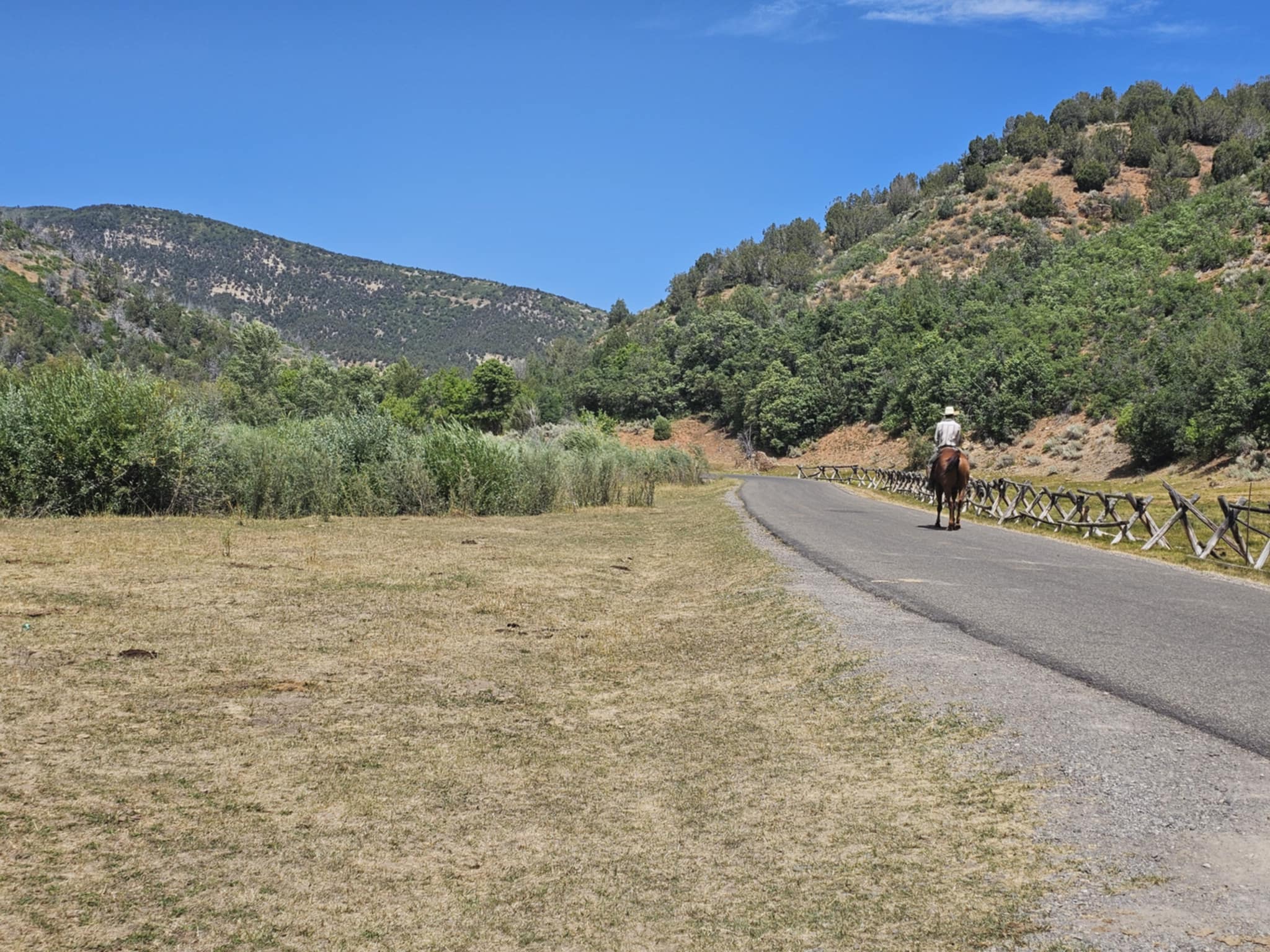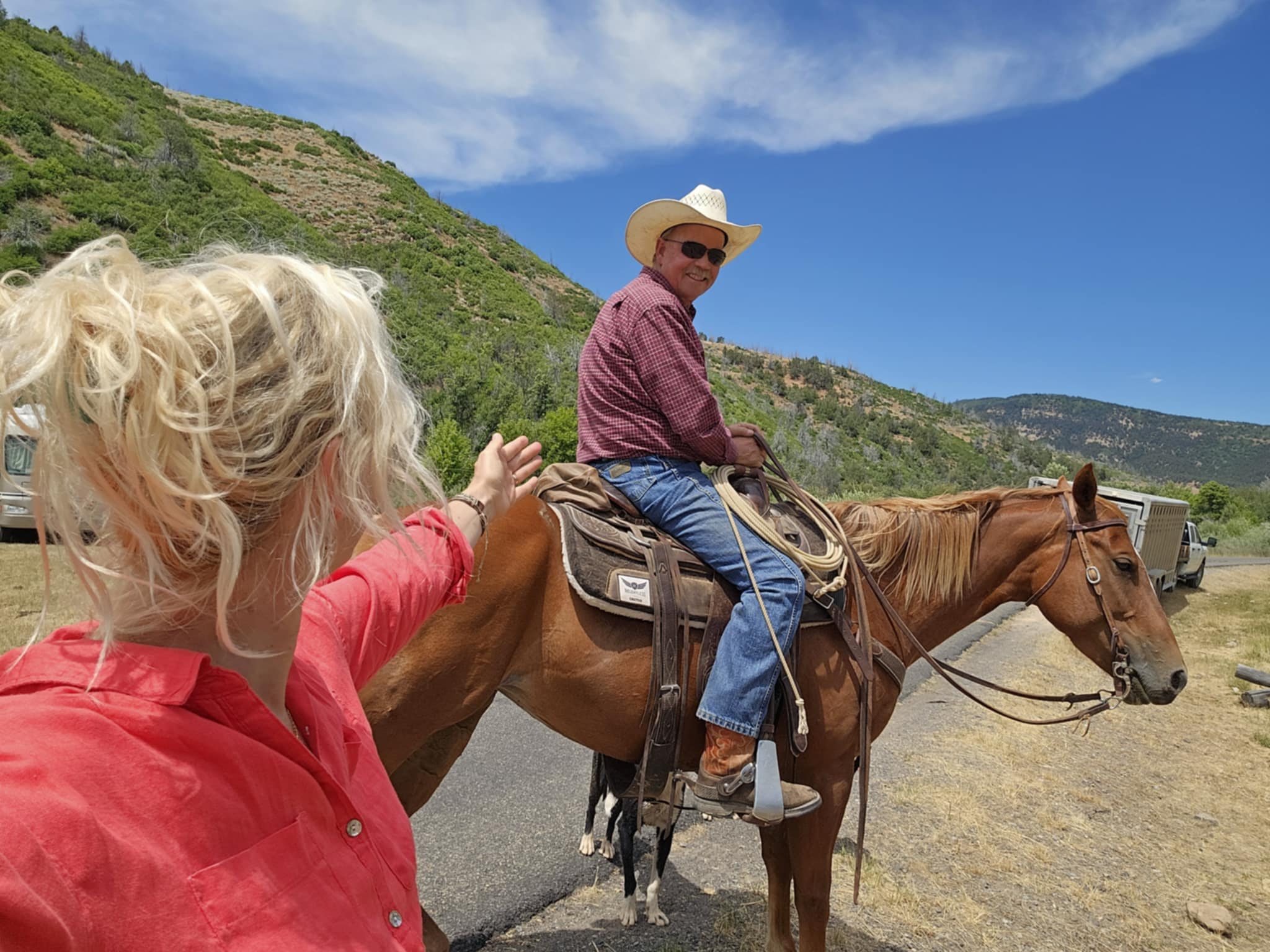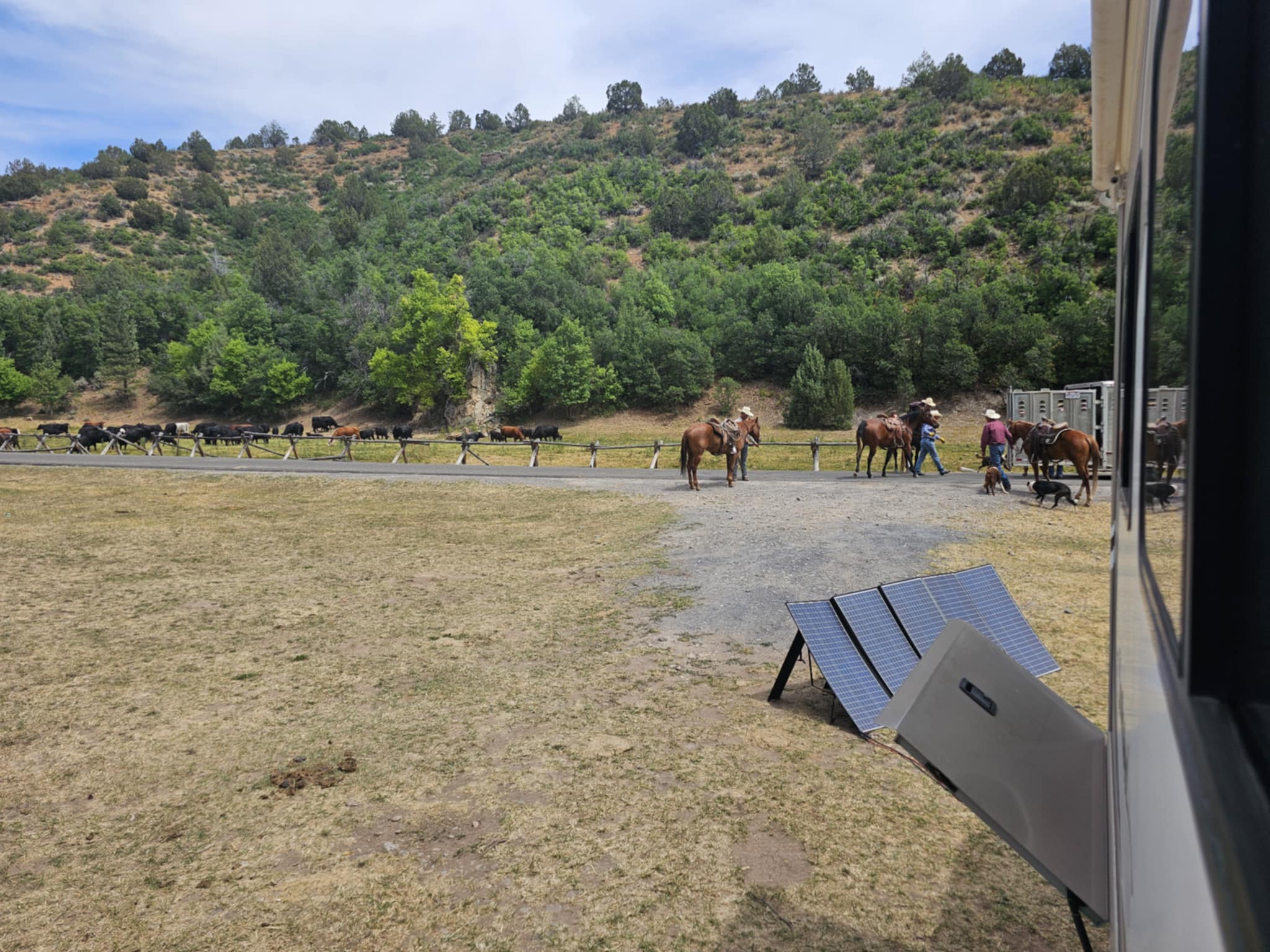Po południu pokazują się prawdziwi kowboje. Kowboje przyjeżdżają autem z przyczepą na konie. Wysiadają, wsiadają na konie i zaganiają stado w jedno miejsce. I tak co dzień, bo normalnie krowy są cały czas na wolnym wybiegu w dolinie. No prawie jak w filmie Yellowstone, tylko teren inny. Ale kowboje……