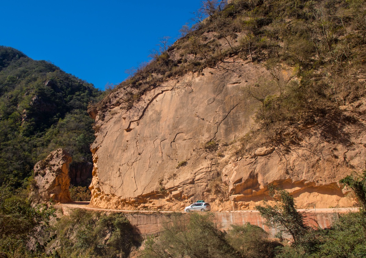 Zaraz za Villamontes droga zmienia się całkowicie. Przyzwyczajeni już od jakiegoś czasu do prawie płaskich przestrzeni, ponownie przyzwyczajamy się do gór. I to ie byle jakich. Z każdym zakrętem droga staje się bardziej wymagająca. Już dawno zmieniła się w szutrową. A teraz zwężyła się znacznie i miejscami zmieści się tu tylko jedno auto. Gorzej jak musimy minąć się z ciężarówką. Trzeba obserwować dokładnie drogę ciągnąca się wzdłuż kanionu, aby uniknąć niespodzianki spotkania się z jakimś autem na jednym z przewężeń nad urwiskiem.