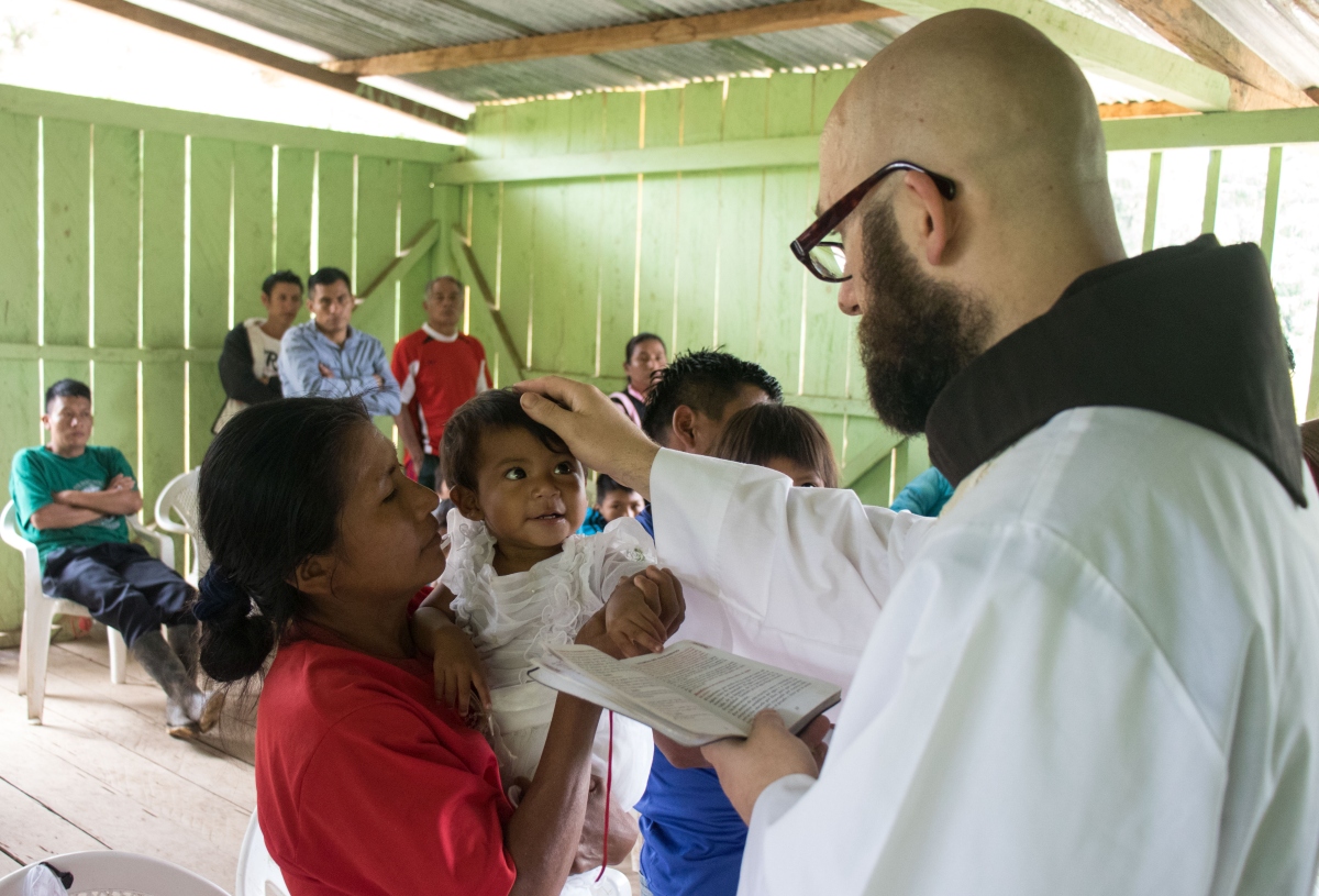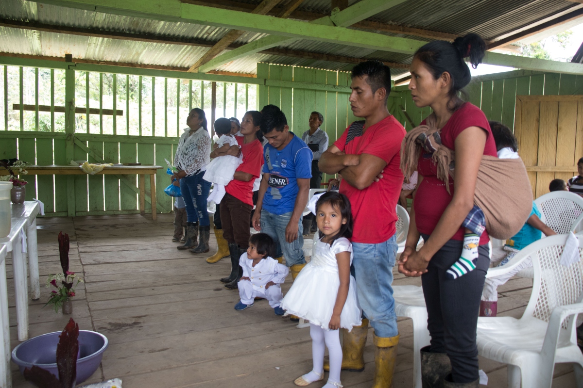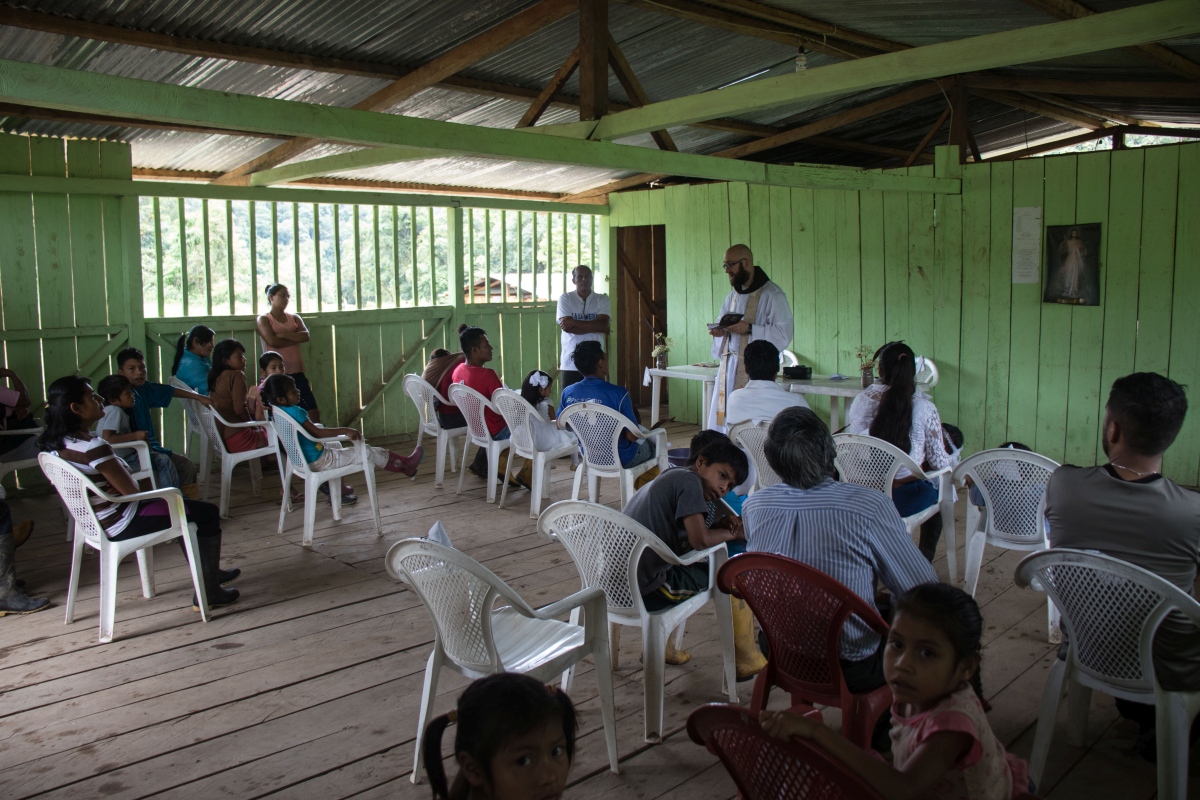 Dopływamy w końcu do wioski. Witają nas już dzieciaki, które z daleka usłyszały hałas motoru w łodzi. Dochodzimy do wioski, w dalszym ciągu siąpi deszcz. Już tak nie leje… Najbliżej rzeki posadowiony budynek to lokalna kaplica, świetlica i miejsce spotkań mieszkańców Chumpianz. W środku plastikowych Stoły i krzesła. Za chwilę schodzą się mieszkańcy. Dziś cztery chrzty. Do wioski misjonarz dociera raz w miesiącu. Choć biorąc pod uwagę drogę, jaką trzeba przebyć, to i tak wyzwanie. Co jest najgorsze? Że ażurowe, zbudowane z desek ściany budynku, pozwalają na swobodny przepływ powietrza. Oznacza to że w pomieszczeniu hula wiatr, który jest potrójnie odczuwalny, gdy masz na sobie mokre ciuchy. Zdjęliśmy kalosze, jesteśmy boso, skarpetki, koszulkę można wyżąć i poleci woda. Proszę jakąś kobietę, by przyniosła mi, pożyczyła spodnie na przebranie. Na godzinę mam suche spodnie (choć bieliznę mokrą…). Tymon spowiada ludzi, potem odprawia mszę i chrzest. Po obrzędach mieszkańcy zapraszają nas na poczęstunek. Stół który służył jako stół eucharystyczny tym razem zamienia się w biesiadny. Mieszkańcy przynoszą trzy wielkie gary, w nich rosół, yuka i chicha. Najpierw jemy rosół na kurach, które mieszkańcy hodują. Yuka też jest uprawiana na miejscu. Dzięki temu, nie trzeba tego przynosić, podobnie jak kukurydzy, która jest głównym składnikiem chichy. Rosół jest zimny. Co może być gorszego od zimnego rosołu? Niesłony zimny rosół… W środku pływa część kury, ale niestety sposób gotowania w Ekwadorze jest taki, że surową kurę (lub jej części) wrzuca się do wrzątku i trochę gotuje. Dzięki temu zachowuje ona swoją twardość i sprężystość mięsa. Oznacza to, że większość kur, jakie jedliśmy w Ekwadorze, jest zdecydowanie trudna do pogryzienia. To nie polska tradycja wolnego gotowania kury do miękkości…