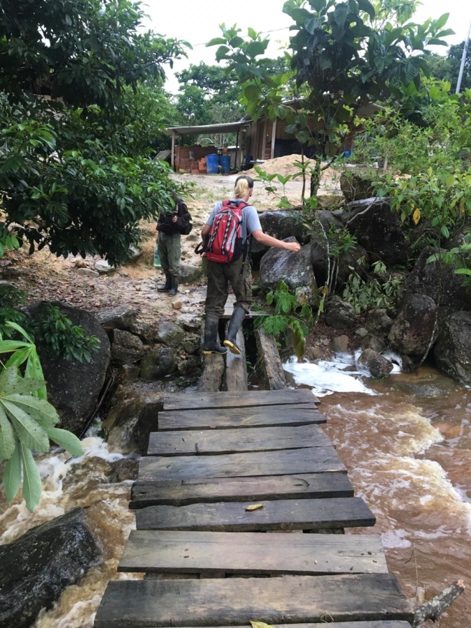 Most do którego docieramy wisi, przerzucony nad rwącą rzeką, ma deski nie szersze niż 60 cm. Wiele z nich ze starości, z wilgoci nie wytrzymało i stworzyło ażurowe dziury w moście. Dziurawy most, uważaj, patrz pod 24 km trzeba przejść w wielkim deszczu i w gigantycznym błocie.