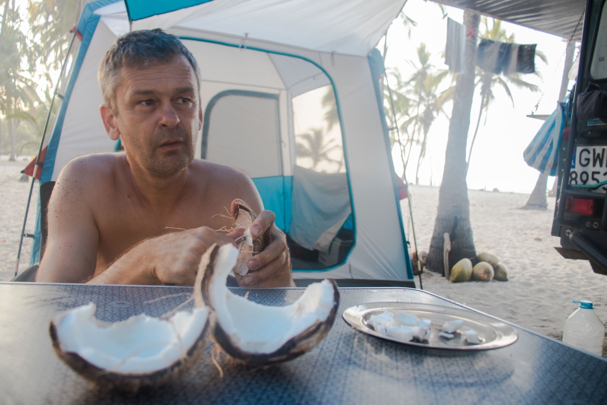 Po podgrzaniu wczorajszej zupy ze słoików w niecałe dwie godziny byliśmy znowu głodni! Nawet podjadanie świeżych kokosów nie za wiele pomagało. Dlatego znowu odpalam kuchenkę benzynową, która po naprawie zaczęła lepie pracować. Oby jak najdłużej. Robimy makaron z czosnkiem i oliwą i płatki z bananami, kokosem i mlekiem. Na dziś musi wystarczyć.